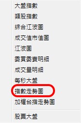 在顯示畫面按右鍵會出現如下之功能選單,提供「集中」/「店頭」/「新編指數」市場之指數走勢資訊: