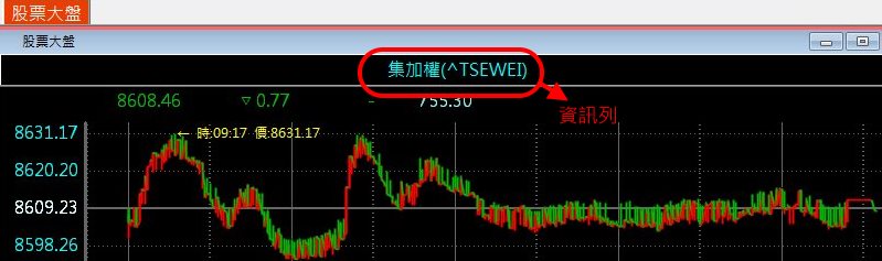 在選單中提供了三種市場指數資訊,「集中」/「店頭」/「新編指數」,在下面畫面中所勾選的市場別為集中市場,可看到資訊列中所顯示的即為集加權指數:
