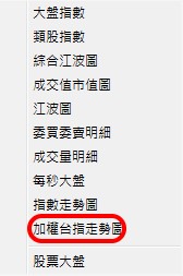 在顯示畫面按右鍵會出現如下之功能選單,提供「集中」/「店頭」/「新編指數」市場之指數走勢資訊: