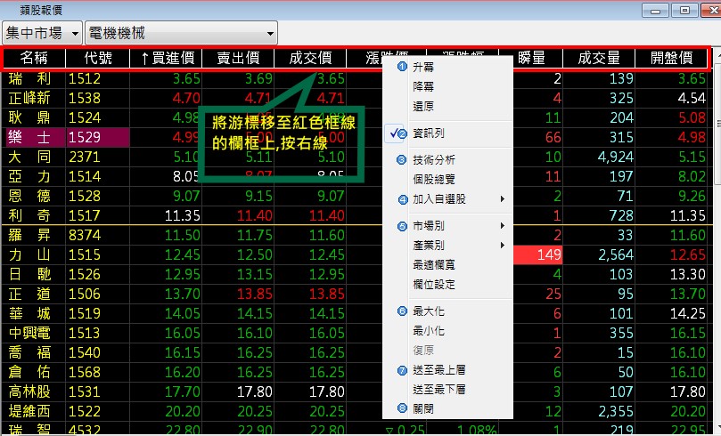參照下圖紅色箭頭處按滑鼠右鍵會出現右方選單,來進行各欄位的排列順序,在本系統的視窗畫面皆提供此欄位排序功能: