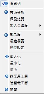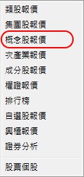當勾選顯示資訊列功能時,可在揭示畫面上方看到出現一概念股市場選單,您可直接下拉選單來選擇所要的概念股個股資訊.