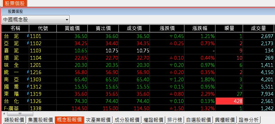 使用者可直接點選概念股個股功能,進入個股行情揭示畫面,使用者可點選下拉式選單挑選概念股所屬個股資訊帶出,顯示畫面如下圖: |
