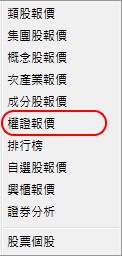 「標的股/權證股」:游標移至該功能可點選所出現選單上的標的股,帶出認購權證之標的股資訊或帶出個股之權證股調資訊切換(選單中打勾者表示目前預設開啟的為標的股票) 。