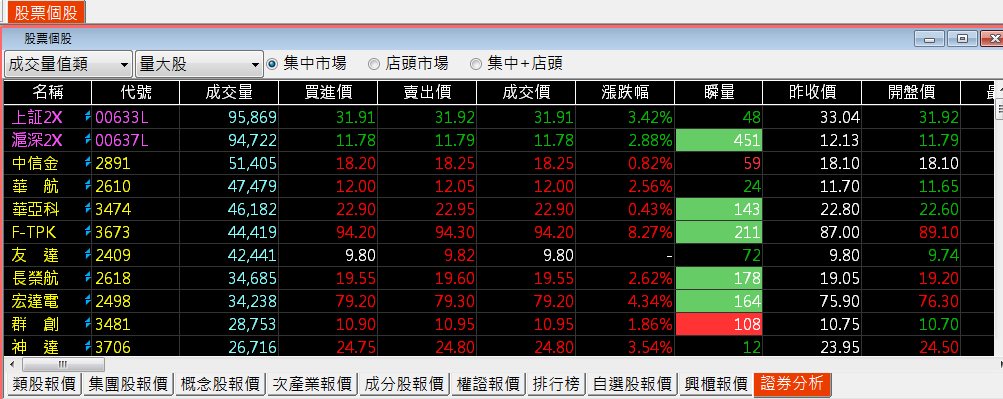 即時提供上市\上櫃成交量值,開盤變化,漲跌變化,買賣變話之相關分析排行表: |