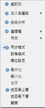 當螢幕開啟多個視窗格時,此功能提供使用者將欲觀看的資訊窗格固於螢幕的最上層,其它視窗放置於最下層,避免多視窗重疊影響所欲觀看的資訊。